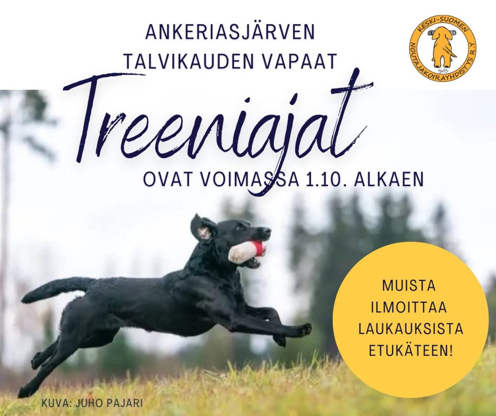 Talvikauden vapaat treeniajat Ankeriasjärvellä astuvat voimaan lokakuun alusta, eli Noutajakoirayhdistyksen jäsenet saavat treenata Ankeriasjärven treenimaastoissa nyt myös viikonloppuisin! (Mahdollisista maanomistajan kanssa sovituista muutoksista infoamme yhdistyksen Facebook-sivuilla aina mahdollisimman hyvissä ajoin eli seuraa ilmoitteluamme!)